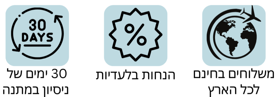 אנחנו כל כך בטוחים במוצר שלנו שהחלטנו להעניק ללקוחות שלנו 30 ימי ניסיון במתנה , במידה ואתם לא מרוצים תקבלו החזר כספי מלא